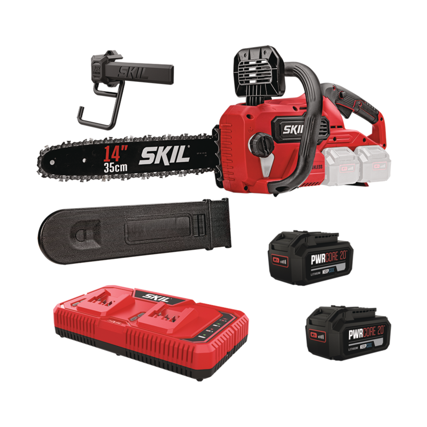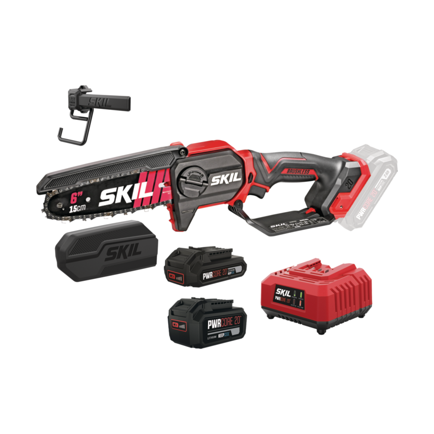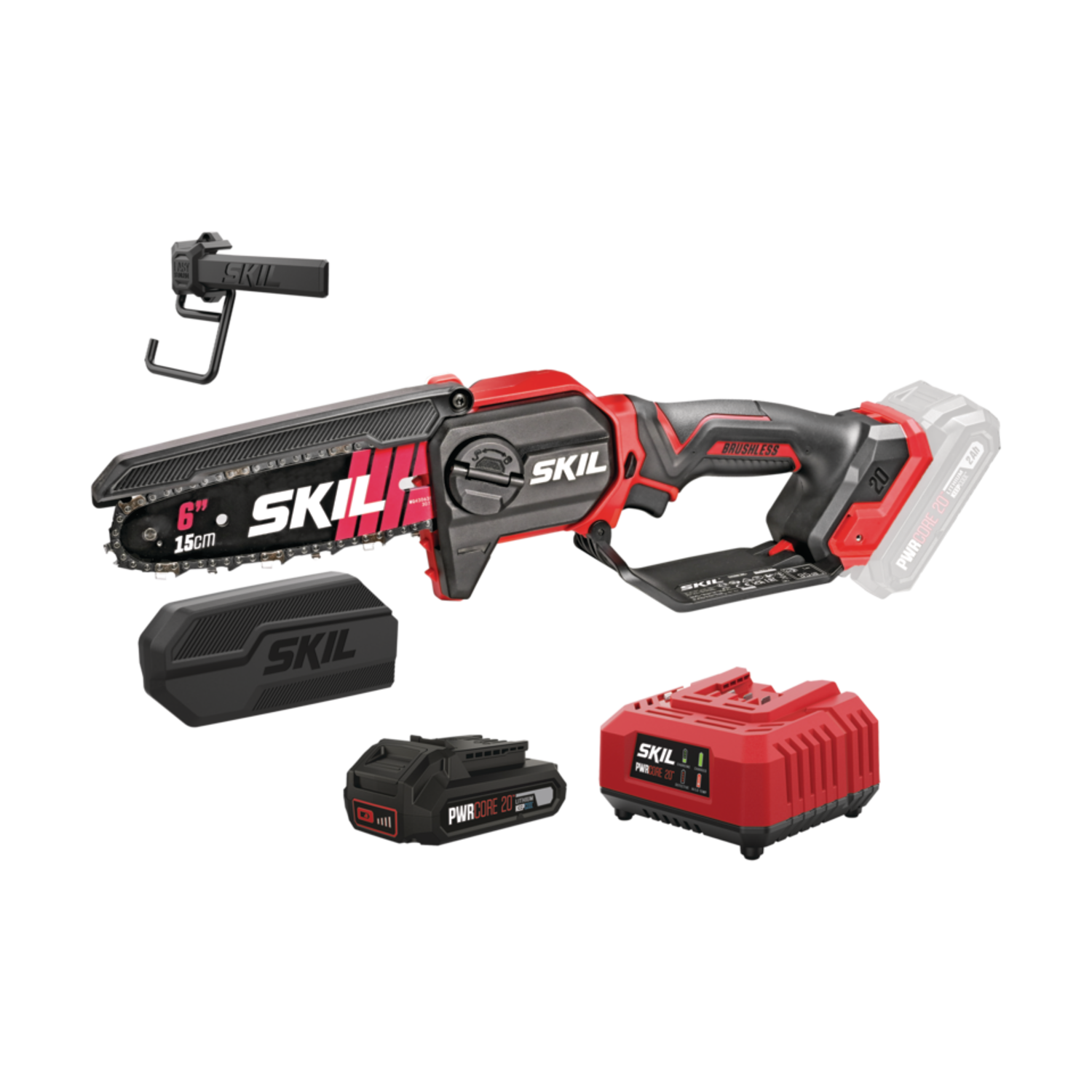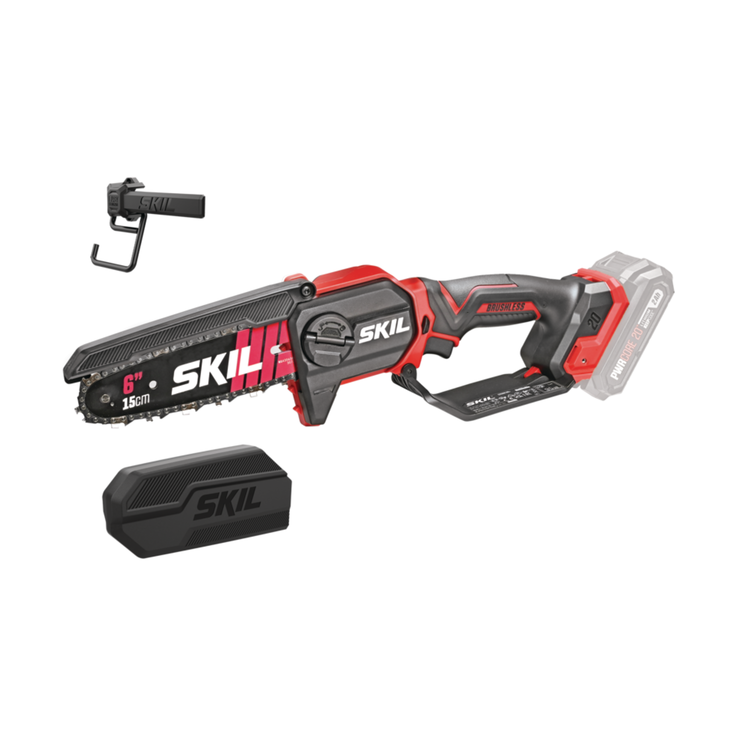 Κλαδευτικό αλυσοπρίονο μπαταρίας (μοντέλο SKIL 0512 CA με μπαταρία 3110 AA), 20V, ελαφρύ και φορητό, σχεδιασμένο για κλάδεμα δέντρων και κλαδιών στον κήπο. Διαθέτει λάμα ~15 cm, brushless κινητήρα, αυτόματη λίπανση αλυσίδας και προσφέρεται ως σετ με μπαταρία και φορτιστή.
